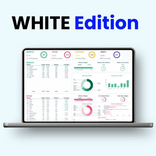 Include il monitoraggio di reddito, spese, debiti, risparmi e abbonamenti, con una struttura semplice e automatizzata. È ideale per avere una visione completa delle tue finanze.