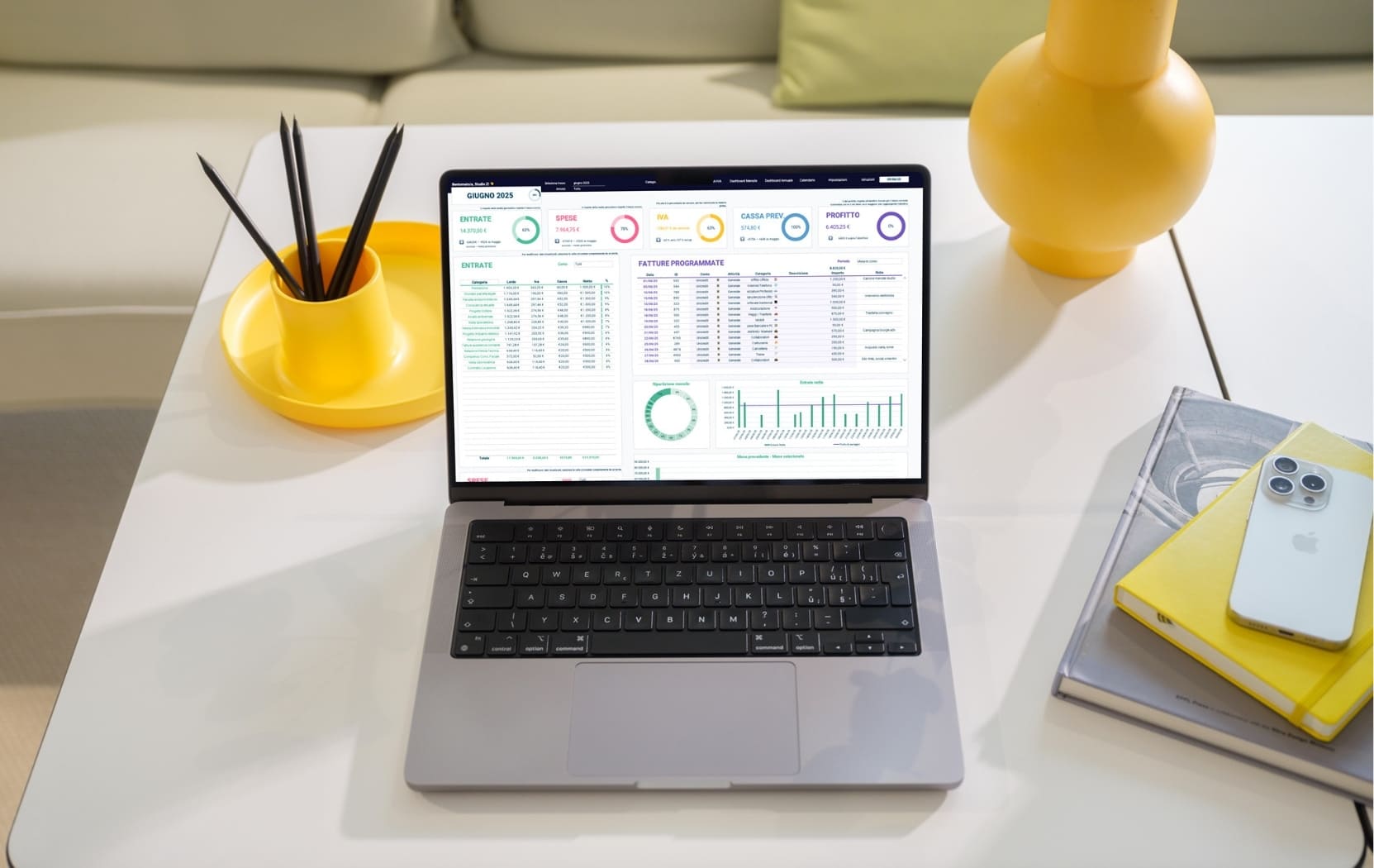 Il Gestione Studio PRO è un foglio di calcolo avanzato per la gestione finanziaria aziendale. Include un tracker per entrate, uscite, IVA, Cassa Previdenziale, conti correnti, carte di credito e pagamenti ricorrenti. È progettato per aiutarti a monitorare e pianificare le finanze del tuo business in modo semplice e intuitivo.